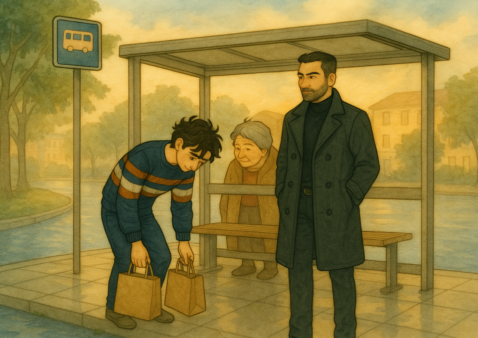 I spotted a bus stop and ran toward it. It was already crowded, people squeezing themselves in, everyone avoiding the rain. I was about to give up when a large, steady hand appeared in front of me, motioning for me to come closer.